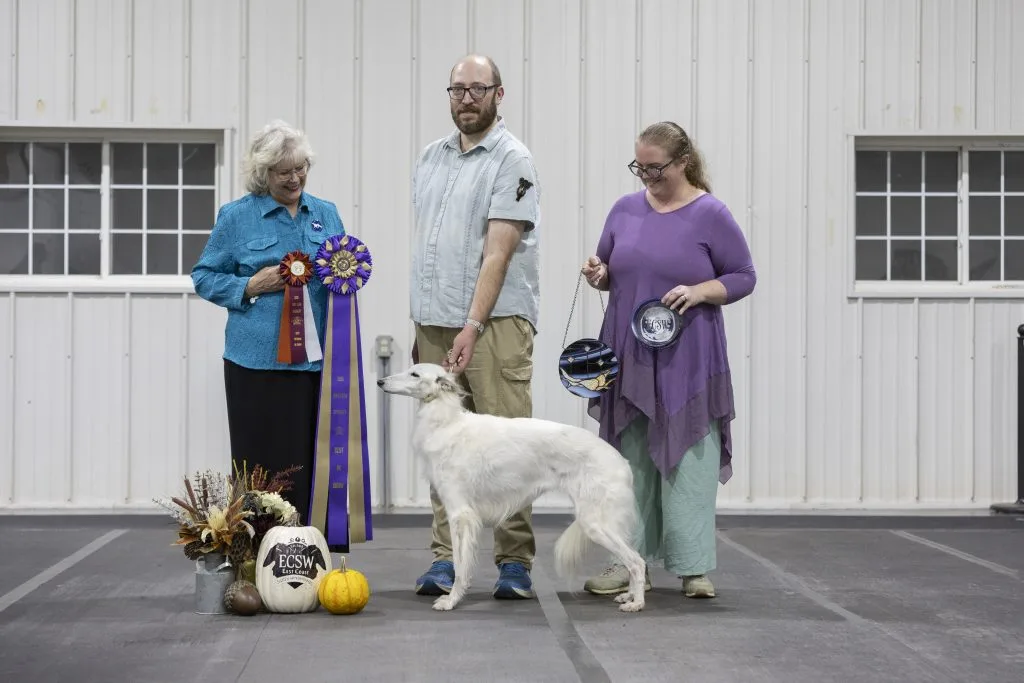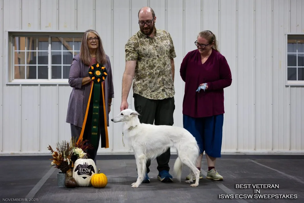 We founded our Silken Windhound kennel with Kristull Honey Ryder, our first Silken that we brought home in 2011. We had never met a Silken Windhound before picking up Honey from the airport as a puppy, but we were hooked instantly. Honey was bred by Kristull Kennels and whelped by Satsuma Silken Windhounds. Honey became our first ISWS Dual Champion and continues to be active in both conformation and performance events to this day. At 14 years old, Honey participated in LGRA Nationals and then the next weekend won Best in Specialty Show at the East Coast Silken Windhound specialty in 2025.