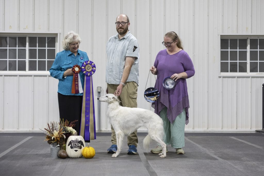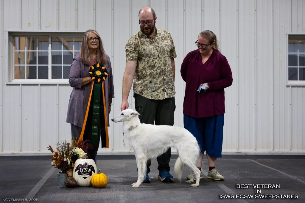 In 2023 she won Best of Opposite Sex, Best of Opposite Sex Veteran, and Best of Opposite Sex in Veteran Sweepstakes at the ECSW Silken Windhound Specialty. In 2024 she won Best Veteran in Sweepstakes, at our national specialty known as Silkenfest. In 2025 she won Best in Specialty Show, Best Veteran in Specialty Show, and Best Veteran in Sweepstakes at the ECSW Specialty.